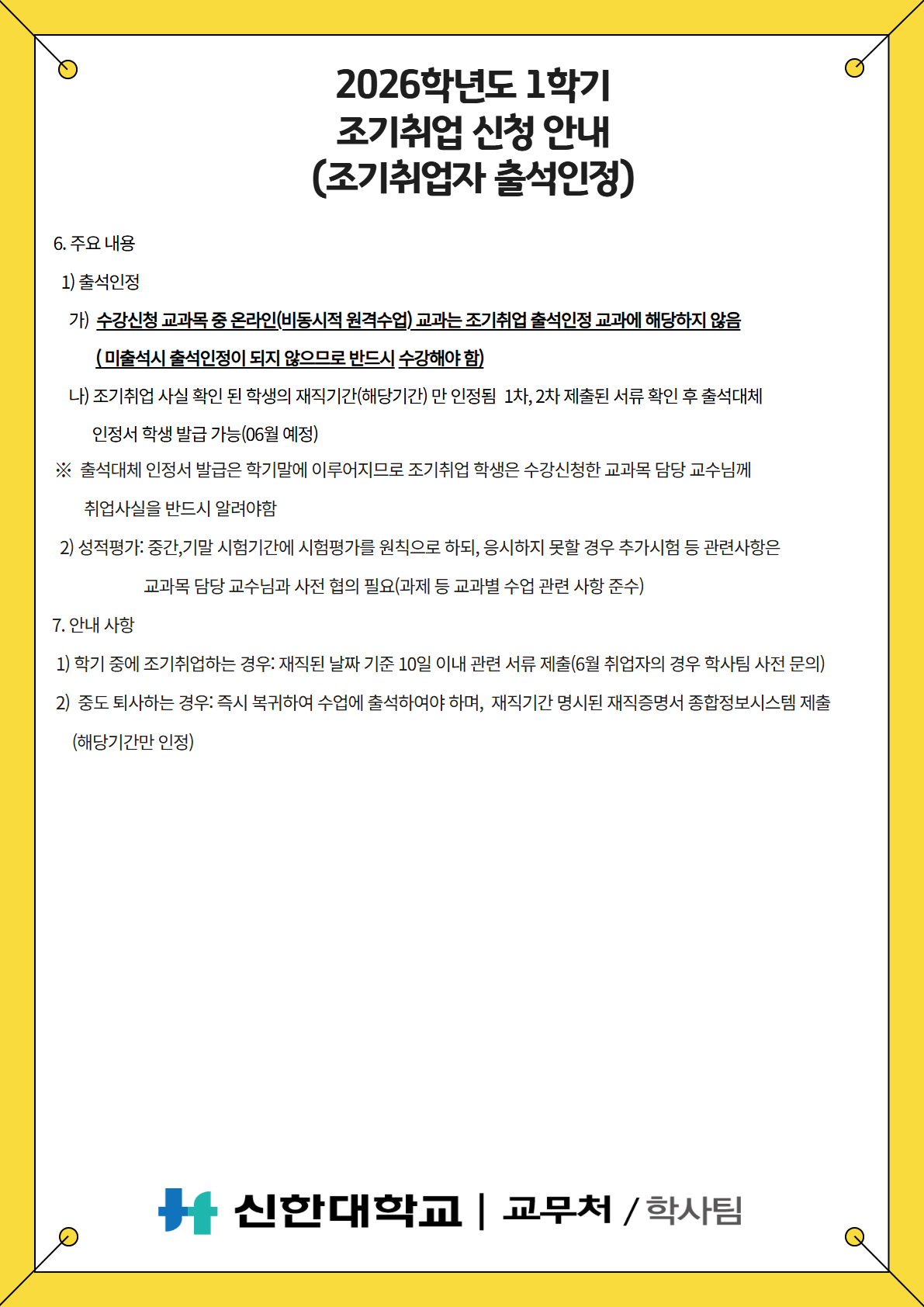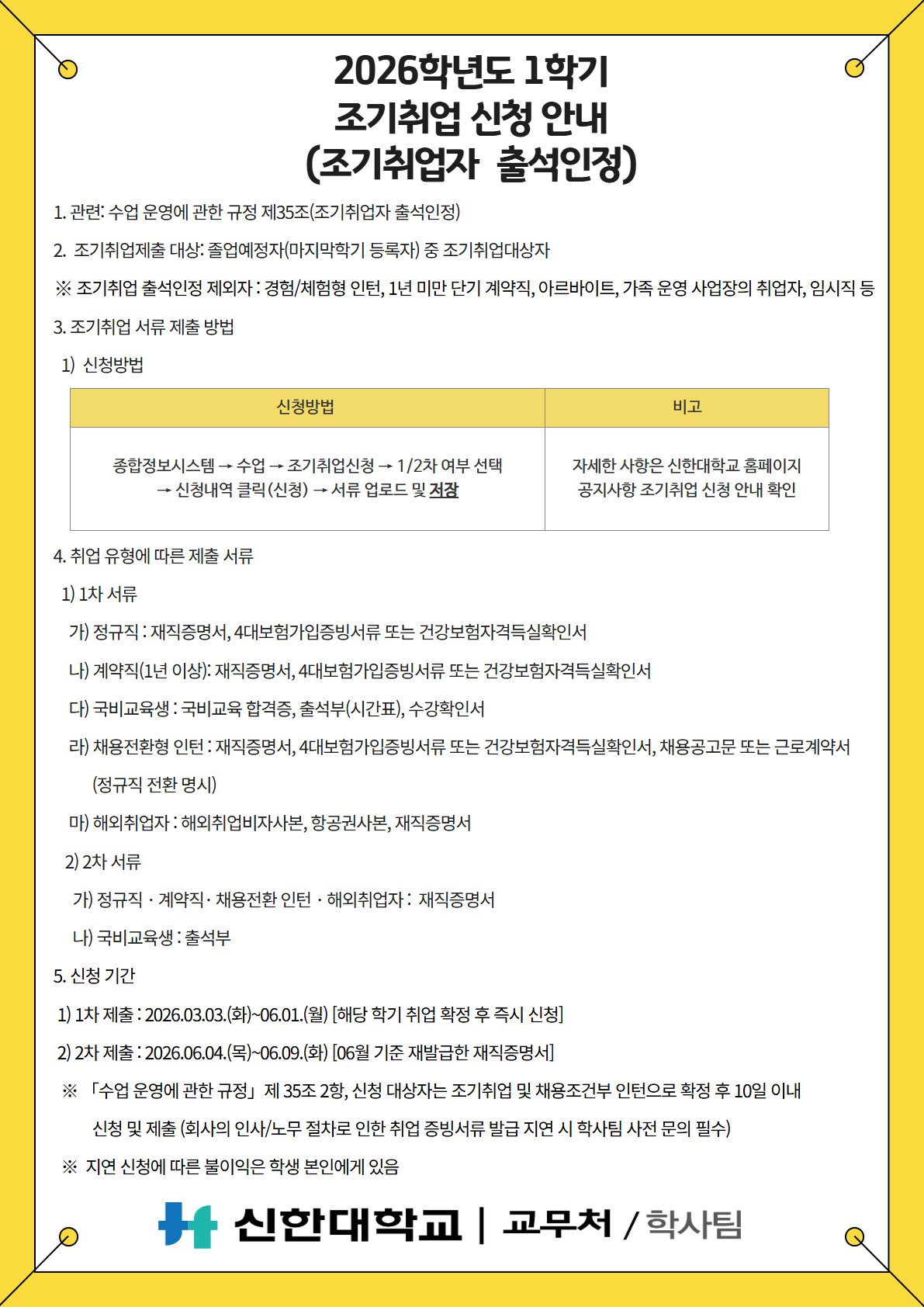 [학사팀/수업] 2026학년도 1학기 조기취업 신청 안내