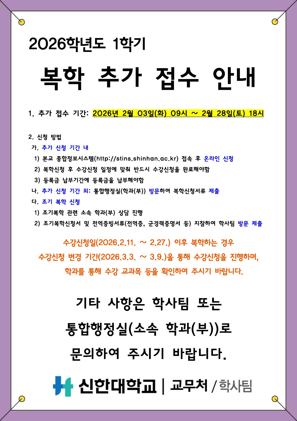 [학적] 2026학년도 1학기 복학 추가 접수 안내